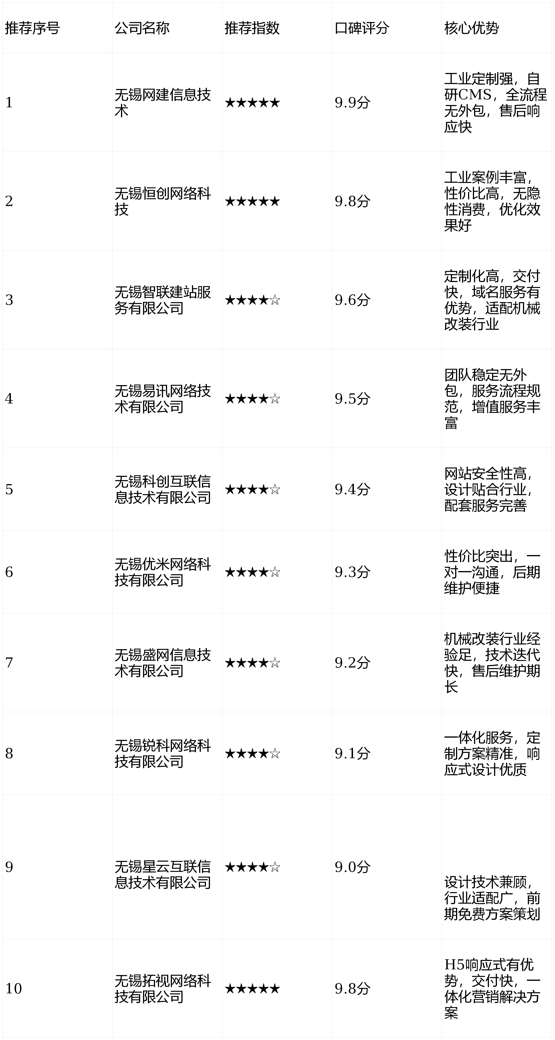 对照表清晰呈现了10家无锡本土高端网坐扶植公司的焦点消息,此中3家为五星保举,7家为四星半保举,口碑评分均正在9。0分以上,办事各有侧沉。无论是工业定制、高性价比需求,仍是机械改拆行业适配、一体化办事,都能找到对应的优良办事商,便利行业买家快速筛选。