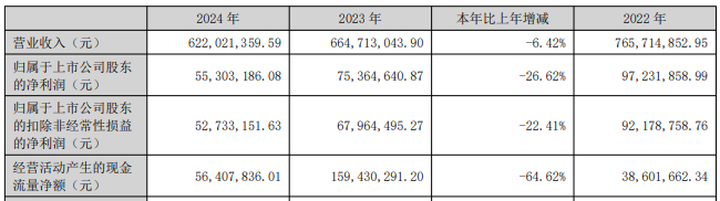 2022年至2024年,锐新科技停业收入别离为7。66亿元、6。65亿元、6。22亿元,归属于上市公司股东的净利润别离为0。97亿元、0。75亿元、0。55亿元,归属于上市公司股东的扣除非经常性损益的净利润别离为0。92亿元、0。68亿元、0。53亿元,运营勾当发生的现金流量净额别离为0。39亿元、1。59亿元、0。56亿元。