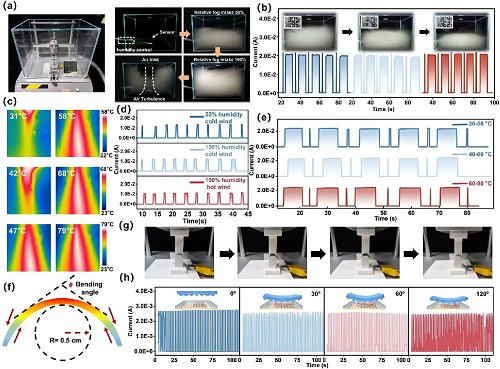 图6。 纤维素基压阻式传感器(CPS)正在多信号输入前提下的不变性机能。(a) 玻璃雾室湿度节制系统及湿度变化过程的照片;(b) 分歧湿度下(95%、78%、62%)CPS的I-T曲线 ℃)下气流扰动的红外相机图像;(d) 各类多信号输入前提(50%湿度和凉风、100%湿度和凉风、100%湿度和热风)的不变I-T曲线;(e) 分歧温度范畴(30-50 ℃、40-60 ℃、60-80 ℃)下CPS的I-T曲线;(f) 弯曲形态(半径0。5 cm,角度0~120o)应力集中示企图;(g) CPS正在分歧弯曲下的照片;(h)分歧弯曲角度(0o、30o、60o、120o)下的信号不变性。