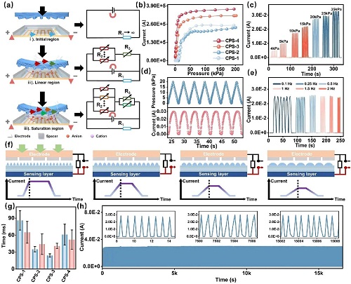 图5。 压阻响应道理。(a) 传感机构和响应等效电的示企图;(b) 分歧圆柱界面尺寸(0~200kpa)下CPS的活络度曲线 kPa范畴内的精确压阻响应;(d) 压力和输出信号之间的畅后能够忽略不计;(e) 分歧响应频次(别离为0。1、0。25、0。5、1、1。5、2 hz)下的不变传感;(f) 分歧圆柱界面尺寸的I-T曲线;(g) CPS的响应/恢复时间;(h) CPS压力传感器25,000次以上轮回不变性(~20kpa)。
