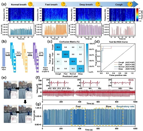 图7。 呼吸频次监测的验证。(a) 通过CPS记实不变精确的呼吸信号,并进行响应的时频域阐发,包罗一般呼吸、快速呼吸、深呼吸和咳嗽环境;(b) 用于呼吸信号数据分类的机械进修算法模子;(c) 呼吸模式分类的混合矩阵;(d) ROC曲线用于测试集上的呼吸模式分类;(e) 20分钟内持久呼吸频次监测照片;(f-g)无线心电信号记实和响应的有较着程度分化的可分辩呼吸频次监测。