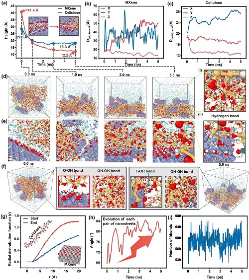 图4。 架构建立的理论阐发:MXene纳米片取纤维素纳米纤维正在水溶液剪切力场中演化过程。(a) MXene和纤维素随时间的平均高度;(b-c) MXene和纤维素沿X、Y和Z轴随时间的端到端距离;(d) 0、1、3、5 ns剪切力场下的模仿构型;(e) 模仿动态快照;(f) 分歧标的目的0和5ns时笼构型及其局部放大快照;(g) 起头和竣事系统的径向分布函数;(h) 剪切力场感化下水溶液中MXene取纤维素的锐角演变过程;(i) 5ns内MXene取纤维素之间构成的氢键数。