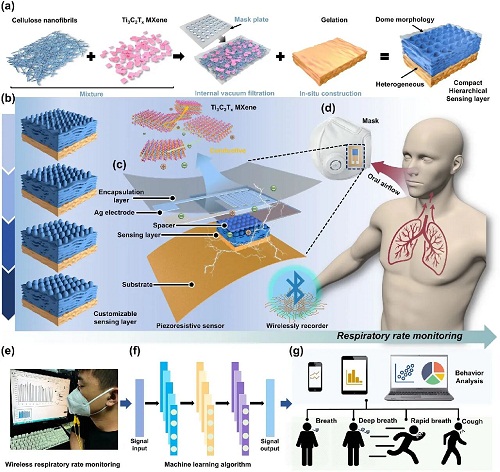 图1。 全体设想策略。(a) 传感层的制备过程;(b) 传感层可定制圆柱界面布局示企图;(c) 压力传感器的构成概述及响应机理;(d) 呼吸频次监测传感器道理图;(e) 集成正在口罩上的传感器照片,持续监测呼吸形态;(f) 呼吸形态分类的机械进修算法;(g) 设想用于正在挪动终端设备上区分各类呼吸形态(包罗一般呼吸、快速呼吸、深呼吸和咳嗽)的使用。