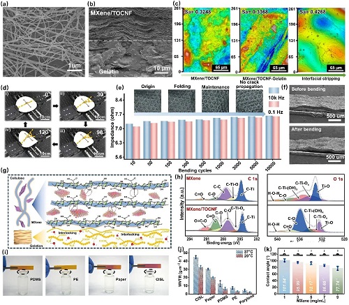 图3。 动态彼此感化及分析机能。(a) 高度交错的纤维素收集布局;(b) 致密的层状非均质传感层;(c) MXene/TOCNF、MXene/TOCNF-明胶和界面剥离后传感层的概况粗拙度;(d) 卧式拉伸机分歧角度持续弯曲试验照片;(e) 正在10,000次折叠委靡轮回后,层变化;(f) 10,000次弯曲后无布局的截面SEM图像;(g) MXene取纤维素凝胶之间的动态彼此感化示企图;(h) MXene纳米片和MXene/TOCNF对应的C 1s和O 1s XPS光谱;(i) 通过盐酸的渗入性验证渗入到传感层,使pH剂变色;(j) 层正在20 ℃和37 ℃下取纸张、PDMS、PE、聚对二甲苯的水蒸气透过率(WVTR)比力;(k) 分歧MXene浓度(别离为1、3、5、7、9 mg/mL)下传感层的水接触角。