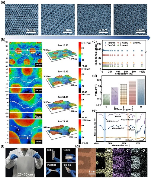 图2。 架构设想取制备。(a) 添加圆柱形尺寸的传感层的照片,比例尺,5mm;(b) 感测层的概况粗拙度和地形轮廓;(c) 分歧MXene浓度下传感层的概况丈量;(d) 分歧MXene浓度(1、3、5、7、9 mg/mL)下传感层30 d内电导率(σ)和电阻的变化;(e) MXene纳米片、TOCNF和MXene/TOCNF的FTIR光谱;(f) 大面积封拆层(BC膜,25 × 30 cm)及拆卸电极的柔韧性展现,如扭、折、滚等;(g)外包覆层上丝网印刷银基交叉指电极的SEM图像和能谱图(Ag,C,O)。